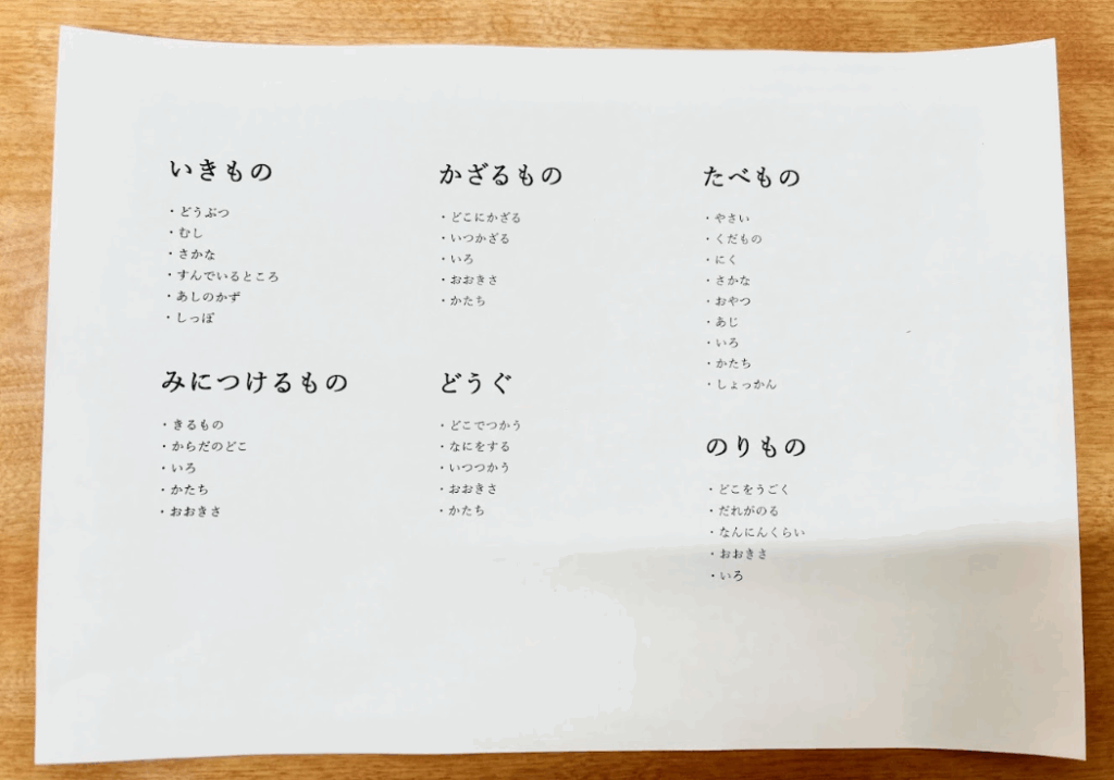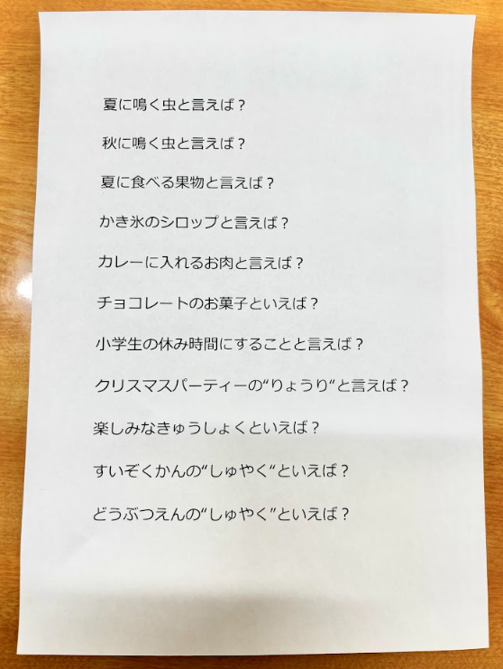 例えば、引いたカードがリンゴの場合「赤くて丸い果物はなんでしょう?」とお子さんに質問し「りんご」と当ててもらってからお互いマークを付けていきます。問題が出せそうなお子さんであれば交互に問題を出し合って進めています。普段は聞かれてばかりですが大人に問題を出せるのが楽しいようです。